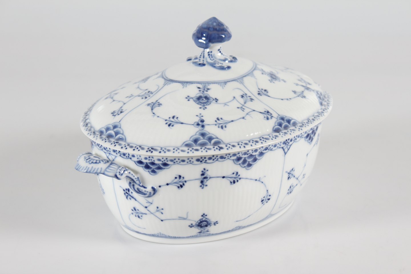 Royal Copenhagen Musselmalet Halvblonde Stor oval terrin nr. 1/595 Med stempel fra perioden 1923-34 Længde 32 cm Bredde 21 cm Højde 20 cm Fejlfri 1.sortering