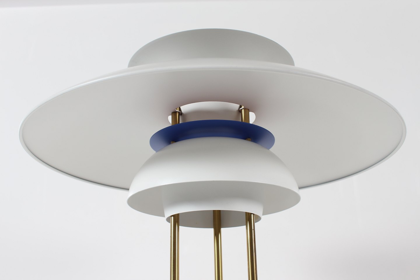 Poul Henningsen (1894-1967) PH 5 bordlampe m/fod af messing og hvidlakerede skærme Højde 62 cm Diameter 45 cm Producent: Louis Poulsen A/S Lampen er i fin stand og fuld funktionsdygtig