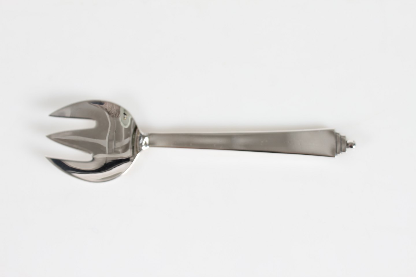 Georg Jensen Sølv Pyramide bestik tegnet af Harald Nielsen 1927 Gaffel i helsølv til agurkesalat, sild og sardiner Længde 13,5 cm Fremstillet af sterling sølv Fin stand uden indgravering eller lign.