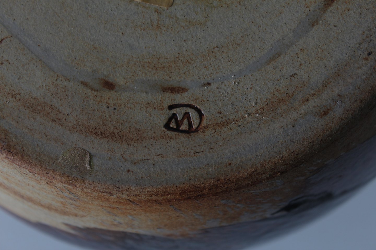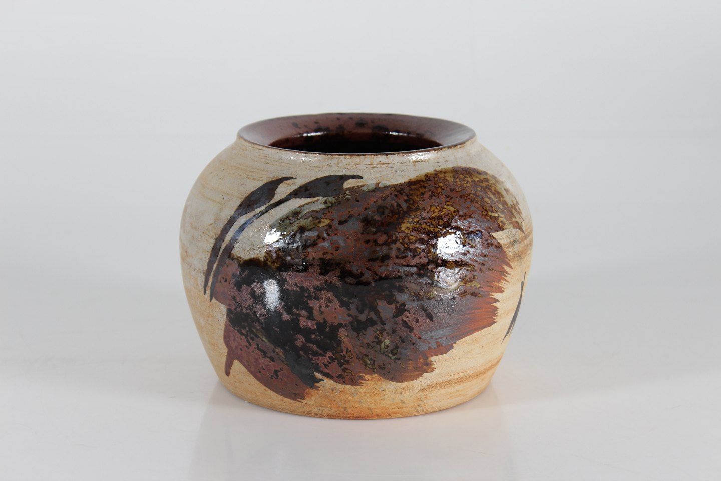 Conny Walther Stor bred krukke af stentøj med abstrakt glasurdekoration Sign. monogram for Conny Walther fra hendes eget værksted Diameter 23 cm Højde 17,5 cm Fin stand uden skår eller rep.