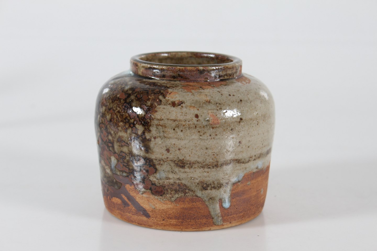 Conny Walther Bojanformet krukke af stentøj med abstrakt glasurdekoration Sign. monogram for Conny Walther fra hendes eget værksted Diameter 13 cm Højde 12,5 cm Fin stand uden skår eller rep.