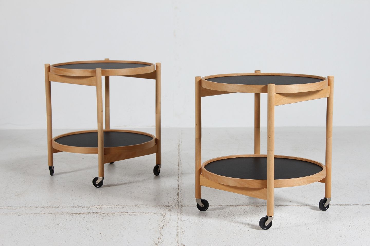 Hans Bølling (1931- ) 2 runde rulleborde af bøgetræ tegnet i 1963 med hvide og sorte vendbare og aftagelige plader Diameter 50 cm Højde 55 cm Fin stand, klar til brug Pris pr. stk. 3.000 Bordene kan beses efter aftale