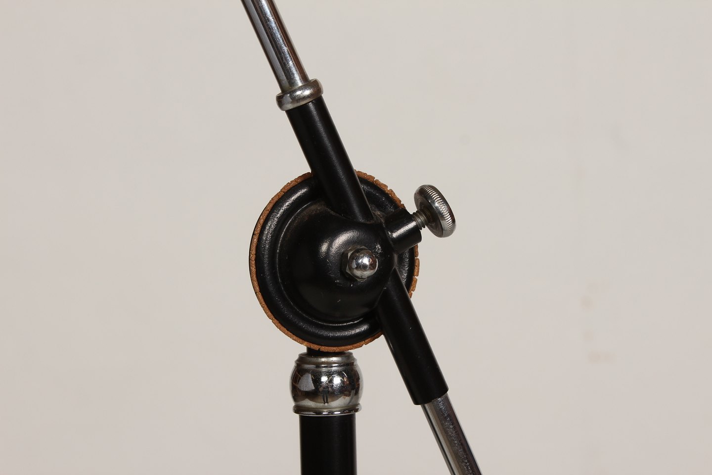 Dansk arkitekt Standerlampe af forkromet og sortmalet metal og støbejern med justerbar højde og kip Monteret med ny plisseret skærm Højde min 148 cm Fin funktionsdygtig stand Lampen kan beses efter aftale
