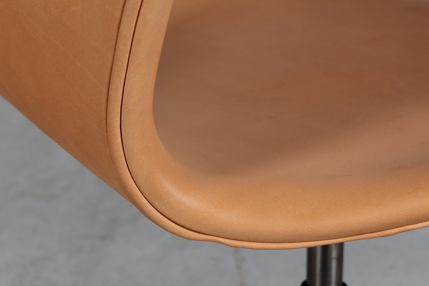 Arne Jacobsen (1902-1971) 7'er kontorstol model 3117 med blødbane hjul Betrukket med lyst natur vegetal anilin læder med let patina Højdejusterbar på 5 hjul Original stol fra Fritz Hansen A/S Fin stand