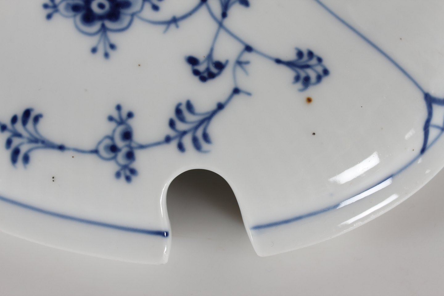 Royal Copenhagen Musselmalet Riflet Oval terrin nr. 1/214 Med stempel fra perioden 1893-1922 Længde 32 cm Højde 20 cm 1. sortering - fin stand uden skår eller revner - med en smule nister i glasuren - se nærbilled