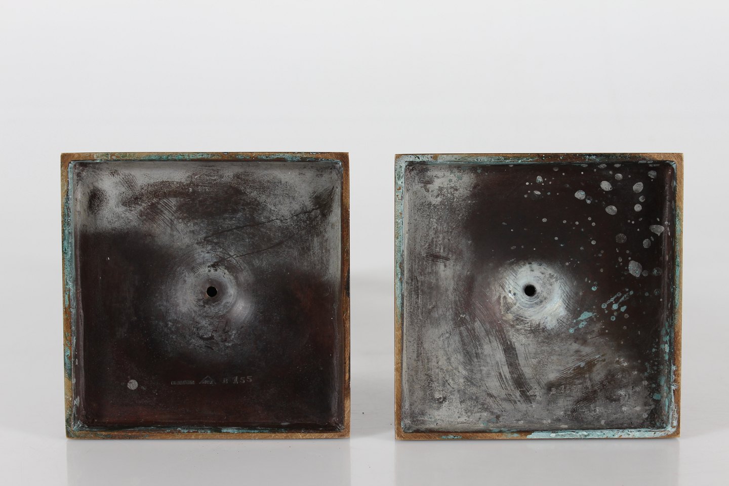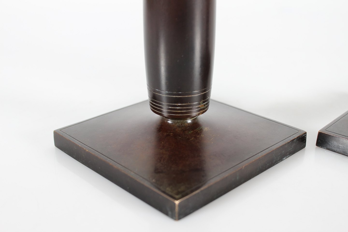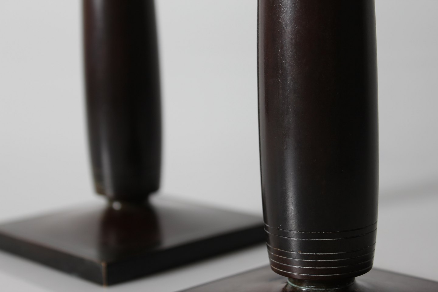 Just Andersen - Danmark Par lysestager af bronze med mørk patina model B 155 Stemplet: Just A - Denmark + model B 155 Højde 25 cm Længde x bredde basis: 11,5 x 11,5 cm Fin stand efter alm. brug med en smule brugsspor