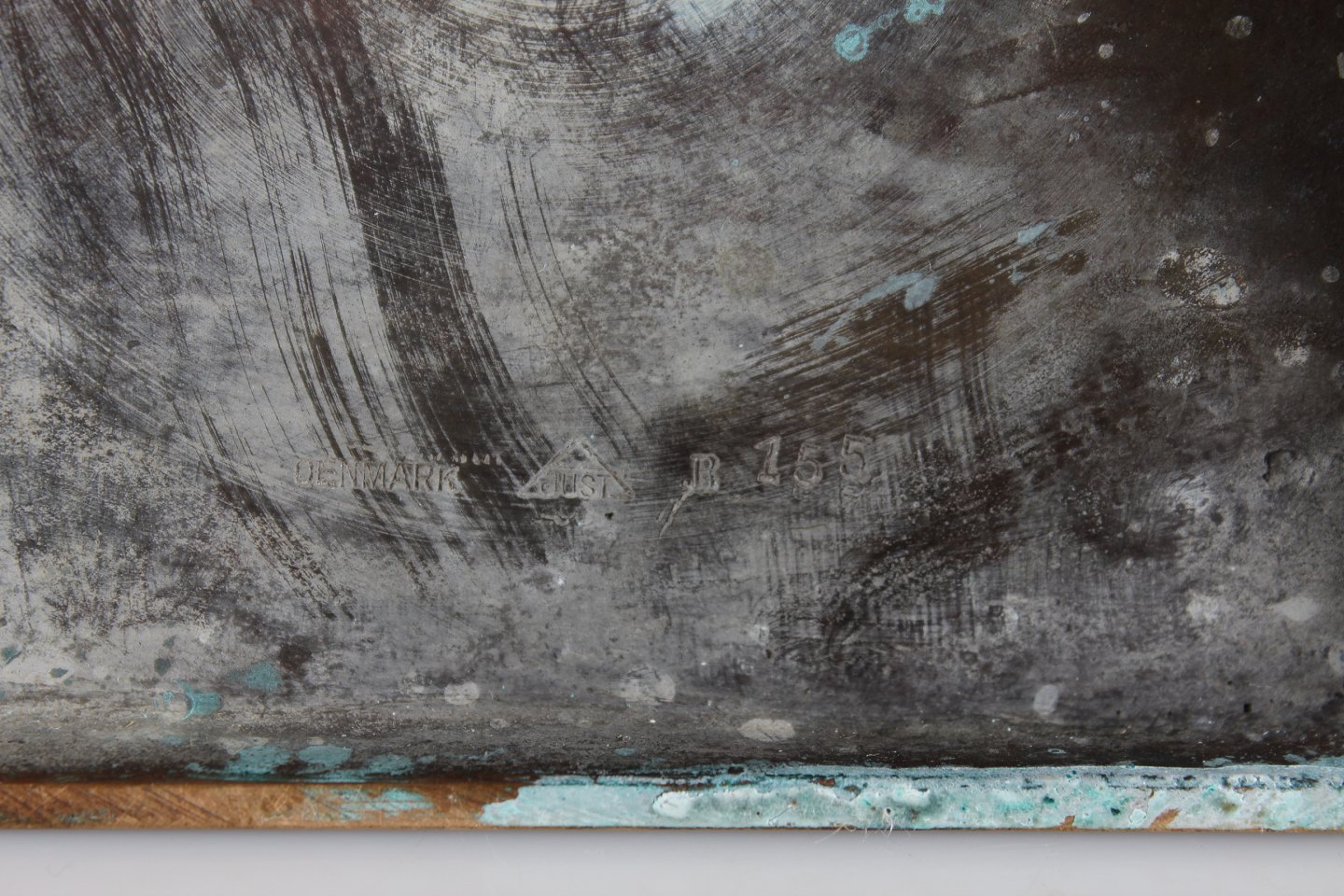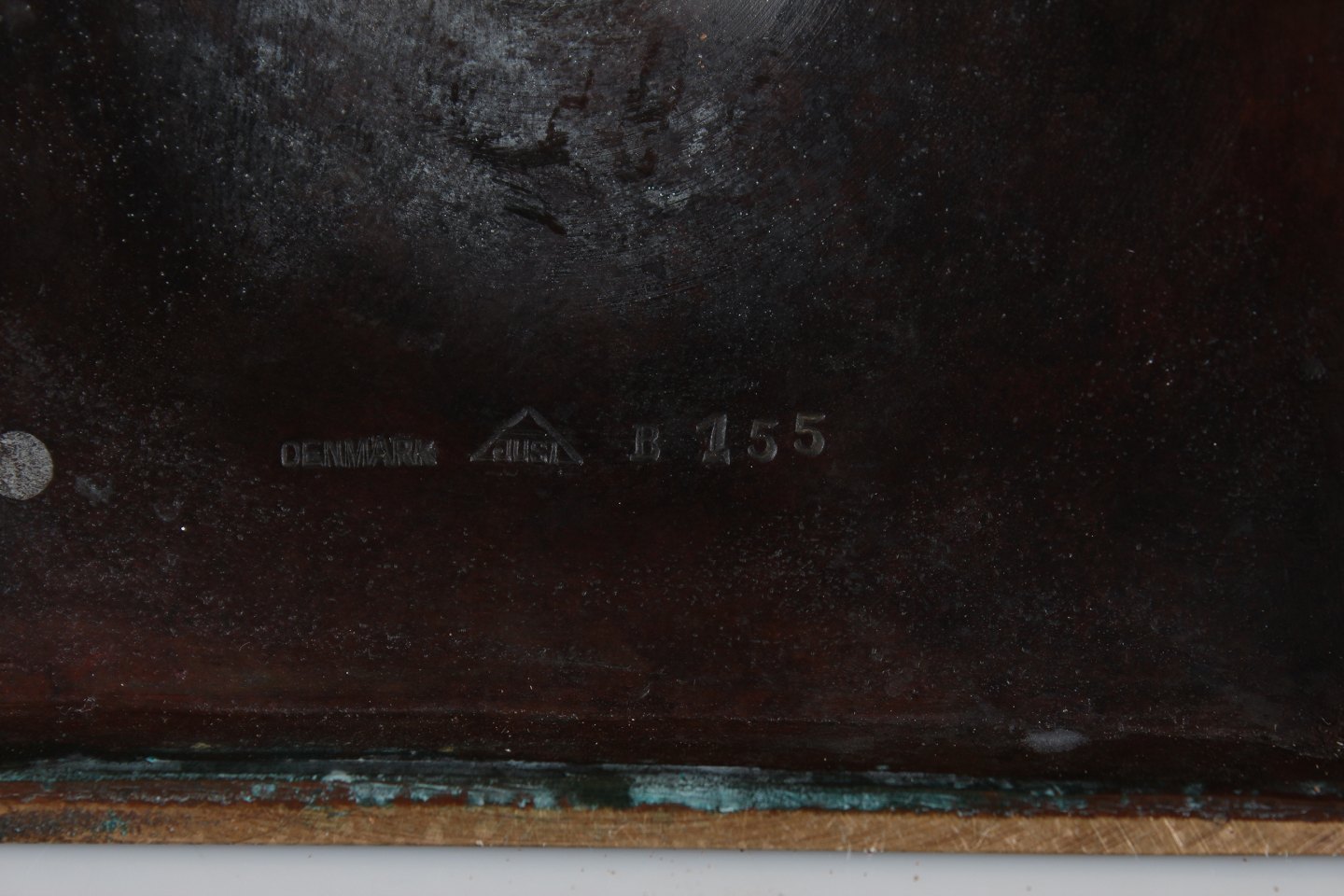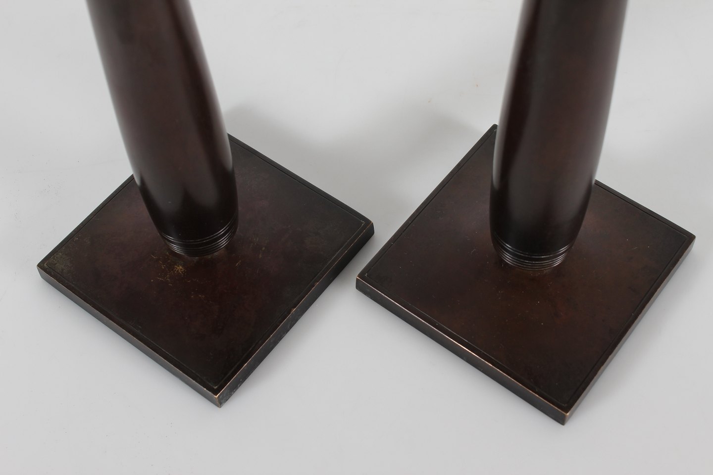 Just Andersen - Danmark Par lysestager af bronze med mørk patina model B 155 Stemplet: Just A - Denmark + model B 155 Højde 25 cm Længde x bredde basis: 11,5 x 11,5 cm Fin stand efter alm. brug med en smule brugsspor