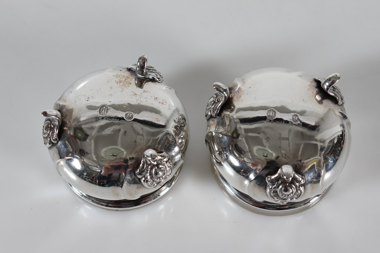 Par sølv saltkar i Rococo form på 3 små ben