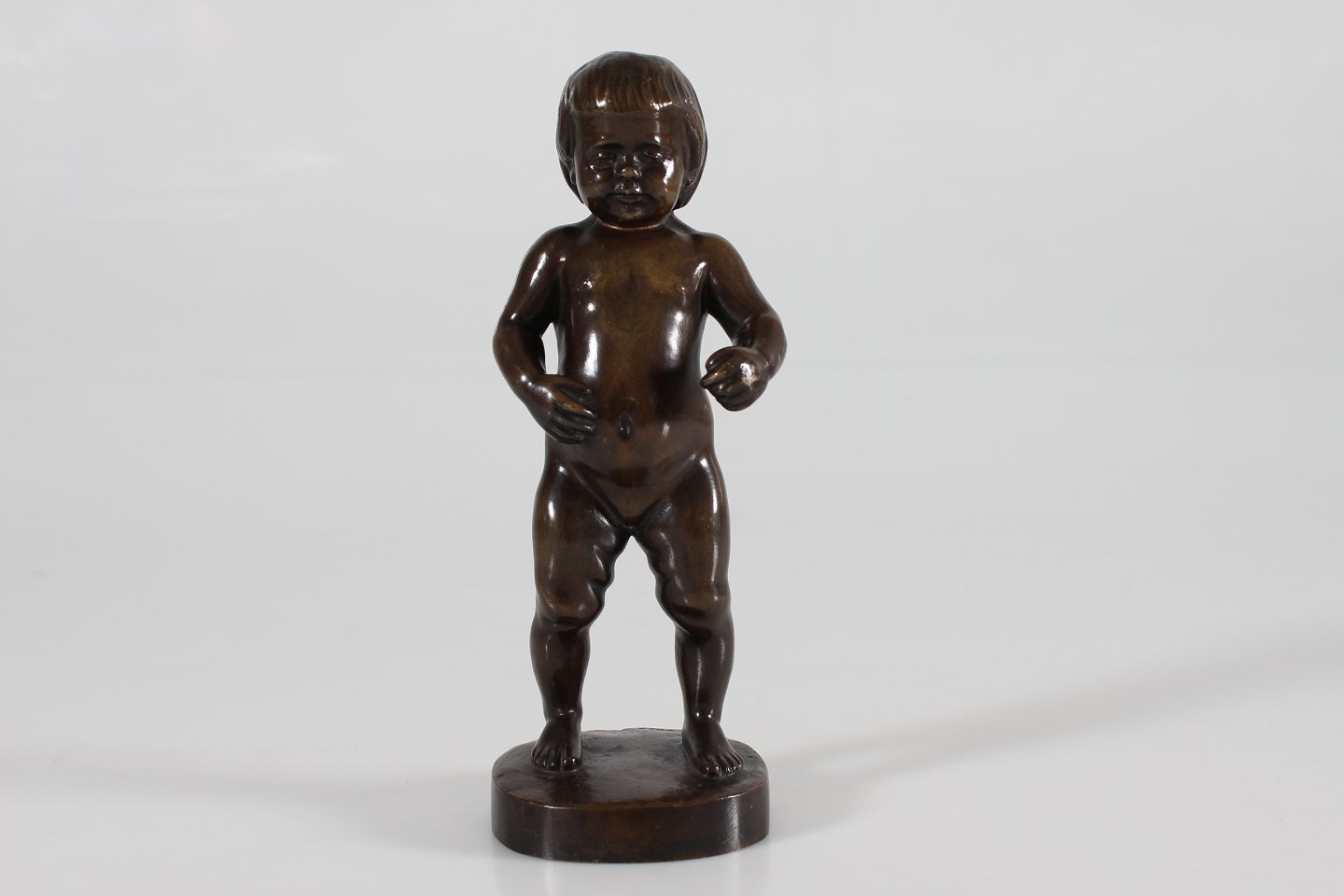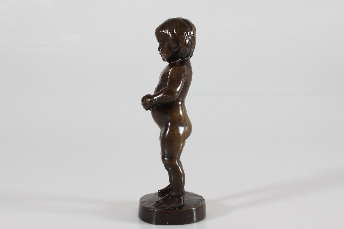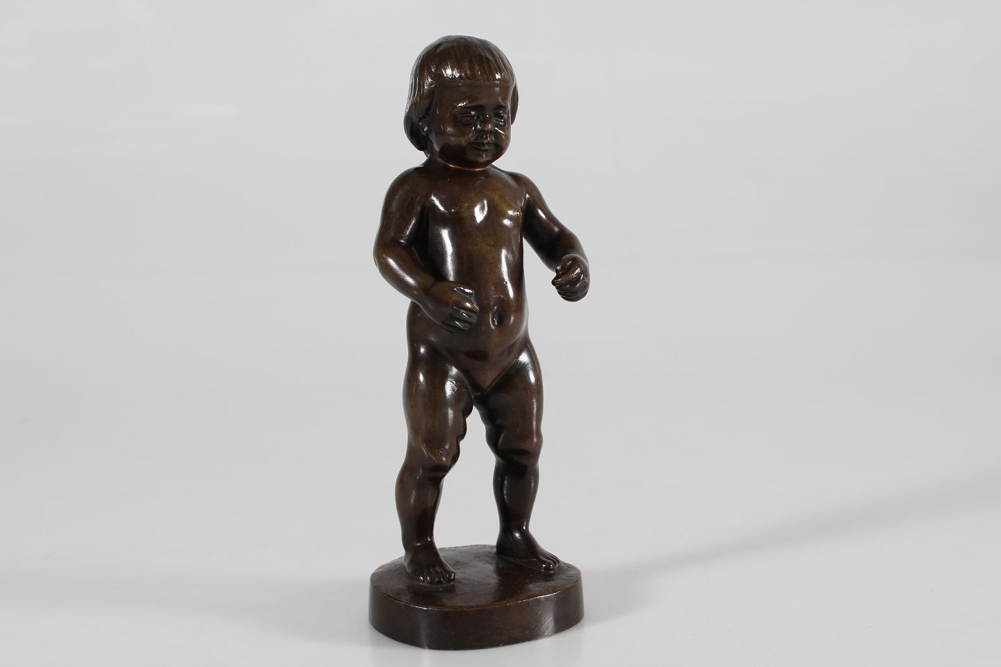 Bronze figur Figur af robust dreng fremstillet af bronze hos August E. Jensens bronze støberi i København Sign. T.H. 1918 Højde 19,5 cm Fin stand med smuk patina og lidt buler på armene