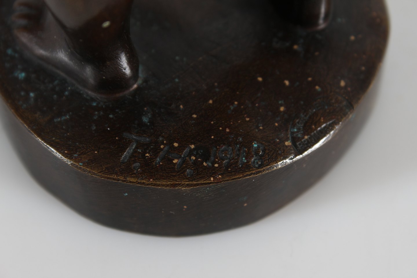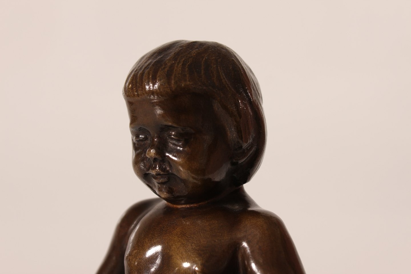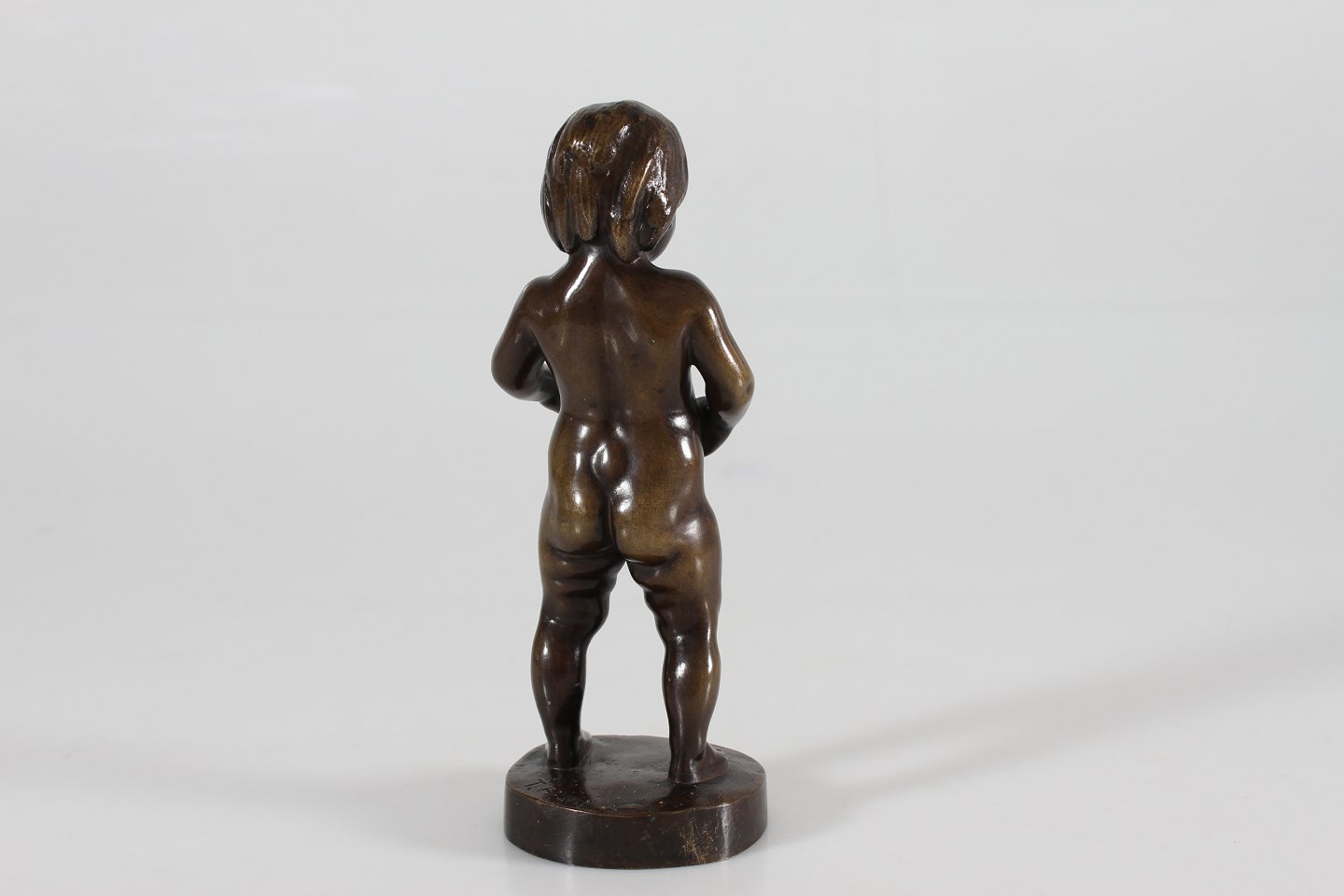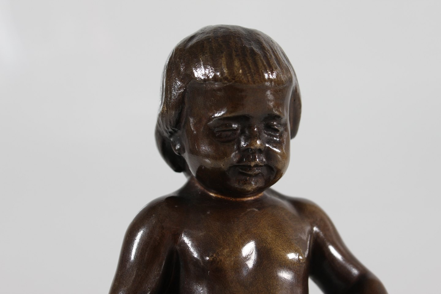 Bronze figur Figur af robust dreng fremstillet af bronze hos August E. Jensens bronze støberi i København Sign. T.H. 1918 Højde 19,5 cm Fin stand med smuk patina og lidt buler på armene