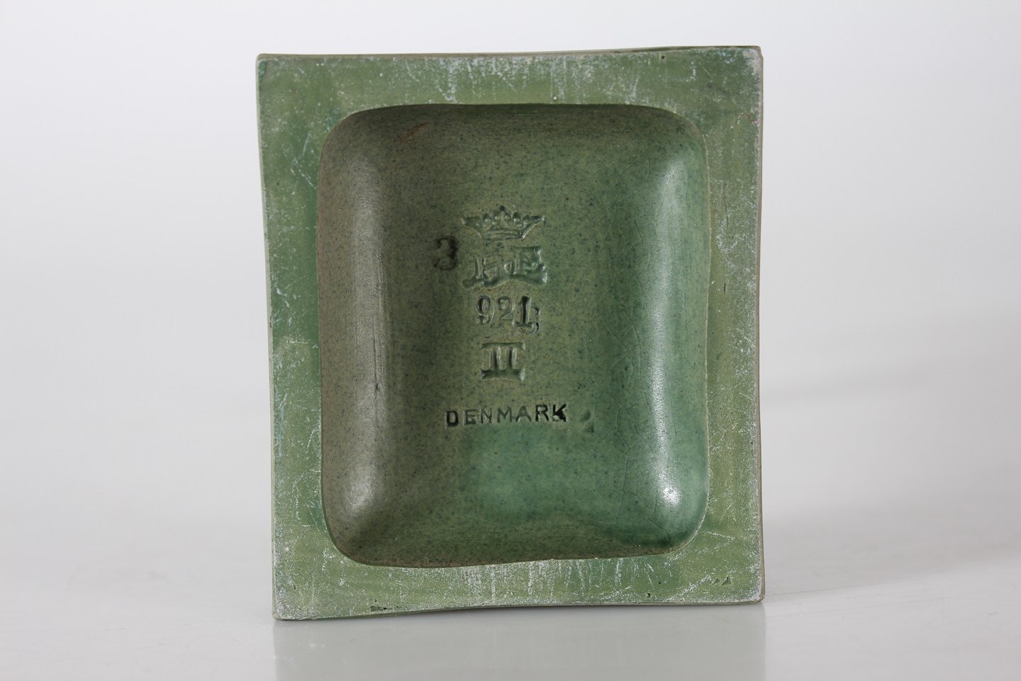 P. Ipsens Enke Figur af pige med blomster nr. 921 Formgjort af Svend Jespersen (1895-1985) Jadegrøn glasur dekoreret figur af keramik Højde 22 cm Fin stand - se billede af lille afslag på basen