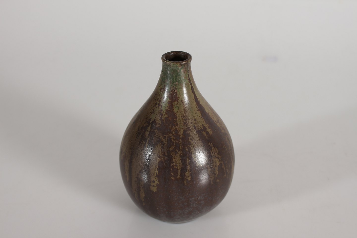 Arne Bang (1901-1983) Dråbeformet vase fra 1930'erne dekoreret med glasur i brunlige nuancer med et strejf af kobber grønt Sign monogram for Arne Bang + 71 Højde 13,5 cm Diameter 9 cm Fin stand uden skår eller reparation