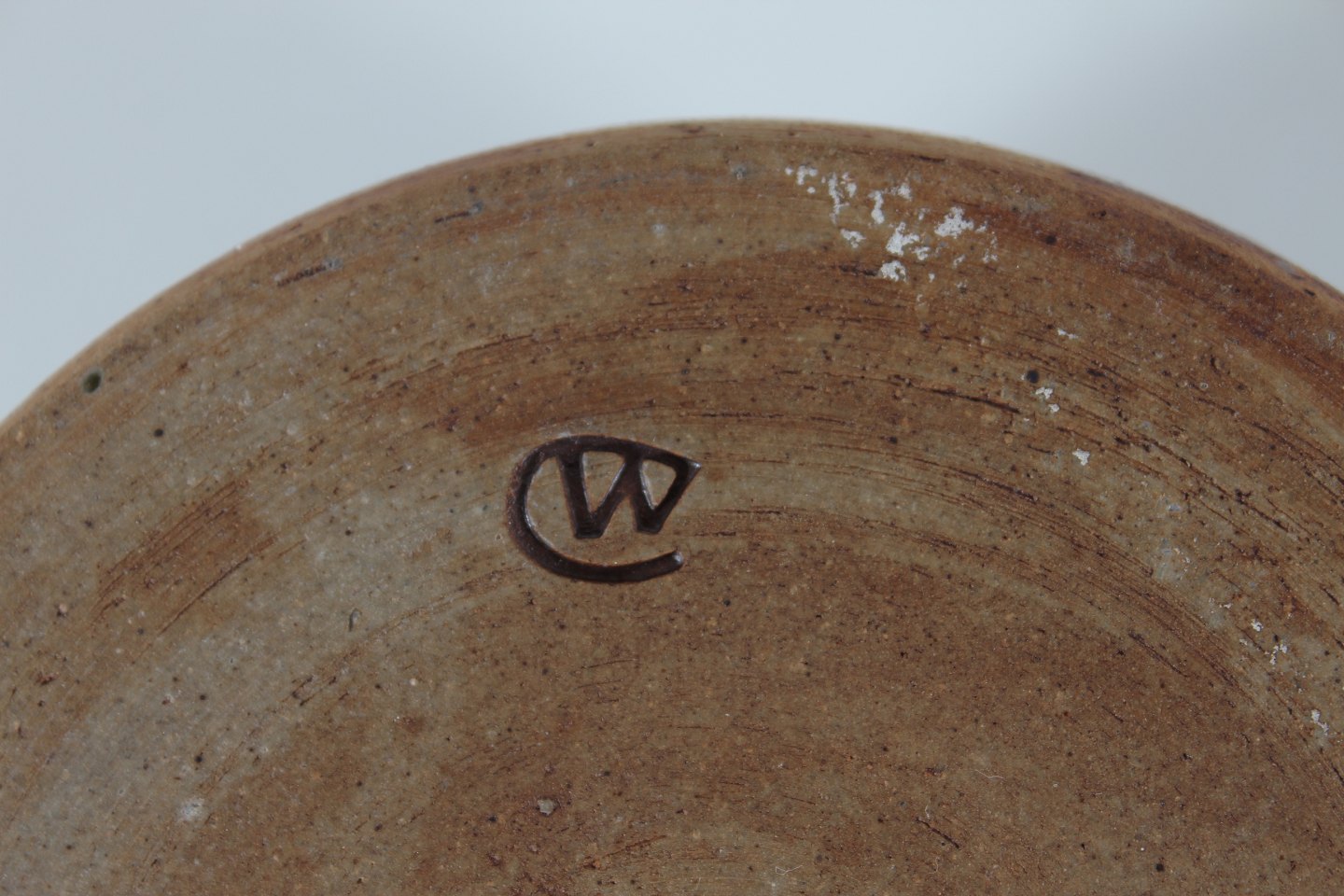 Conny Walther Bojanformet krukke af stentøj med abstrakt glasurdekoration Sign. monogram for Conny Walther fra hendes eget værksted Diameter 13 cm Højde 12,5 cm Fin stand uden skår eller rep.