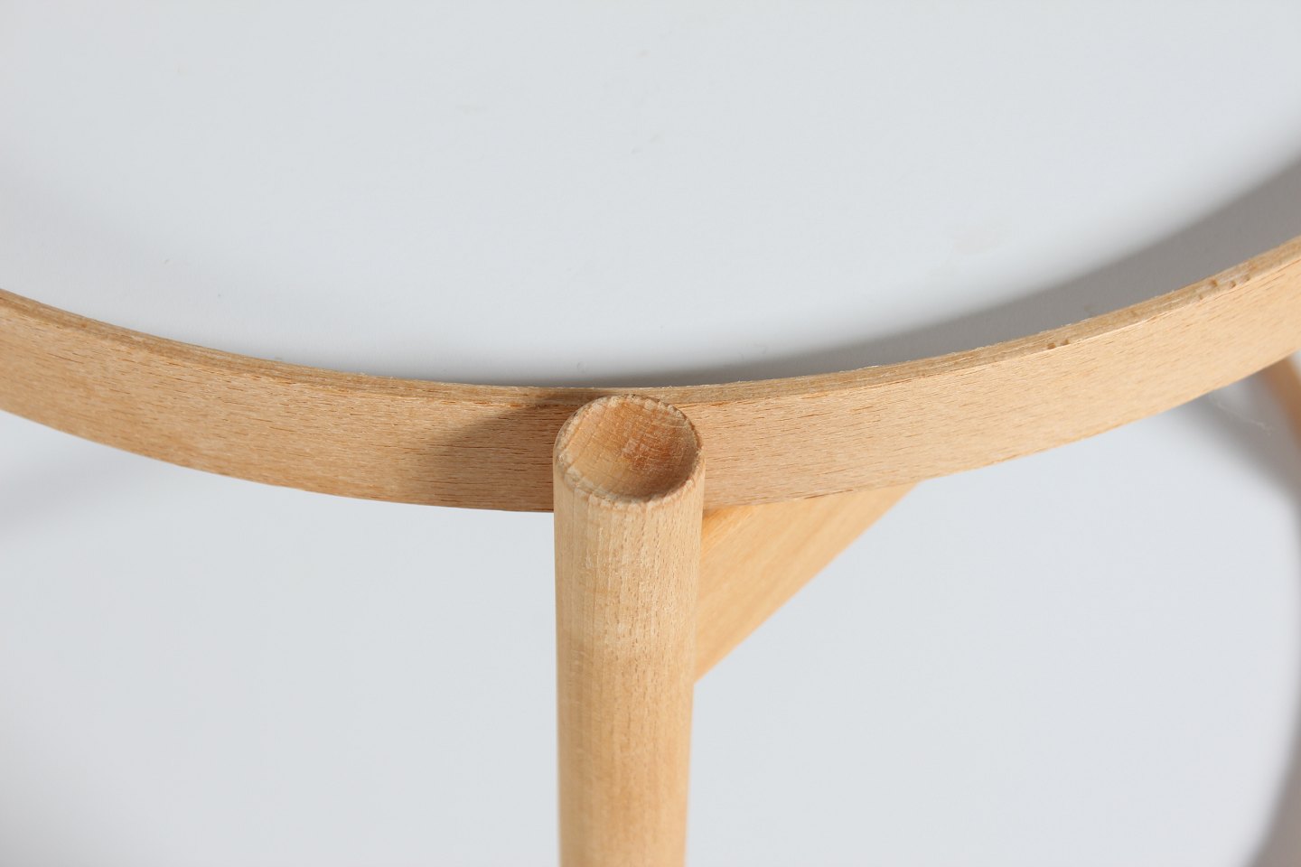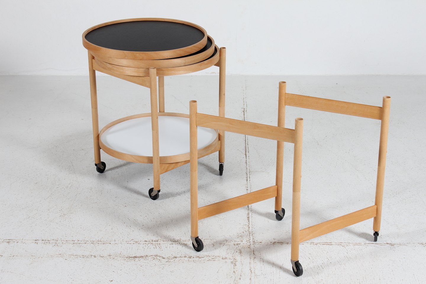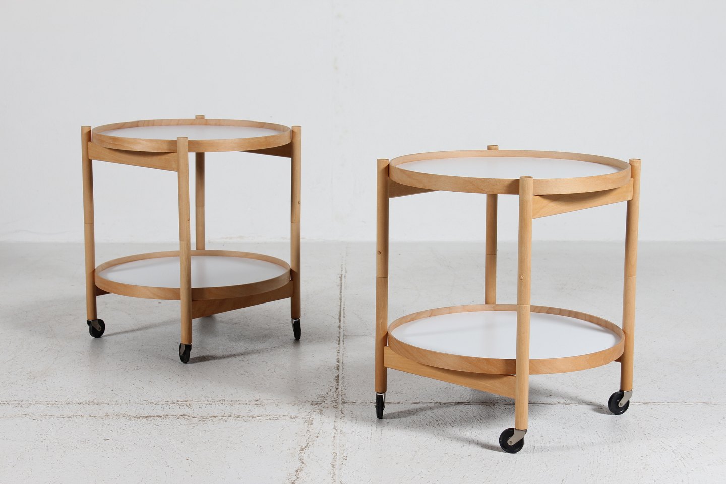 Hans Bølling (1931- ) 2 runde rulleborde af bøgetræ tegnet i 1963 med hvide og sorte vendbare og aftagelige plader Diameter 50 cm Højde 55 cm Fin stand, klar til brug Pris pr. stk. 3.000 Bordene kan beses efter aftale
